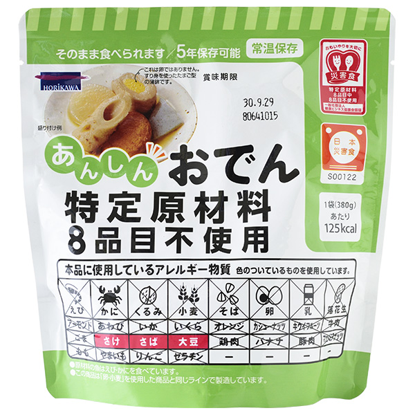 大根、こんにゃく、さつま揚、焼ちくわ、たまご型蒲鉾の5種5個が入ったレトルトおでんです。 特定原材料8品目不使用、常温保存が可能です。 |
